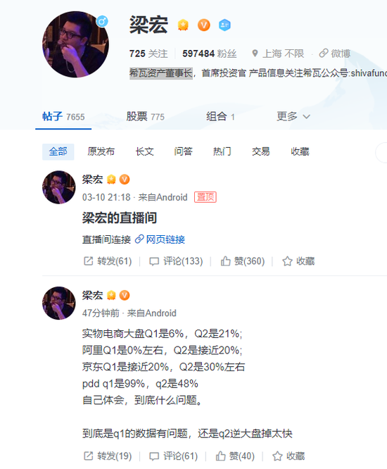 “实物电商大盘Q1(GMV增速)是6%,Q2是21%;阿里Q1是0%左右,Q2是接近20%;京东Q1是接近20%,Q2是30%左右;拼多多Q1是99%,Q2是48%。”在雪球,实名认证用户、基金经理“希瓦资产董事长”梁宏发帖疑问:(拼多多)到底是Q1的数据有问题,还是Q2逆大盘掉太快?