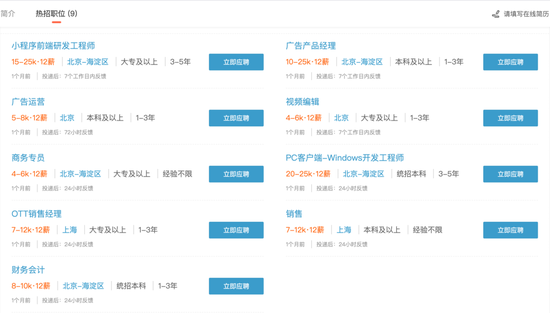 显然,暴风集团公告中仅剩的10余人已经无力拯救这家公司。但是,Tech星球查询招聘网站后发现,就在一个月前,暴风科技还曾对外发出招聘,岗位包括小程序前端研发工程师,PC客户端-Windows开发工程师、财务会计、广告运营等岗位。