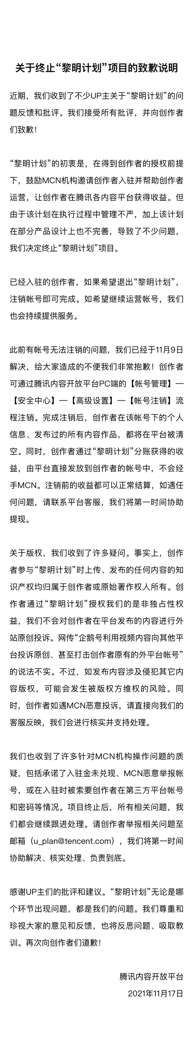 11月17日早间消息,腾讯内容开放平台发文,称因执行中管理不严及产品设计不完善,导致了不少问题,决定终止“黎明计划”,并向UP主们道歉。针对外界关于“黎明计划”在版权及MCN操作中的问题,腾讯称欢迎举报并负责解决到底,“不论哪个环节的问题,都是我们的问题。”