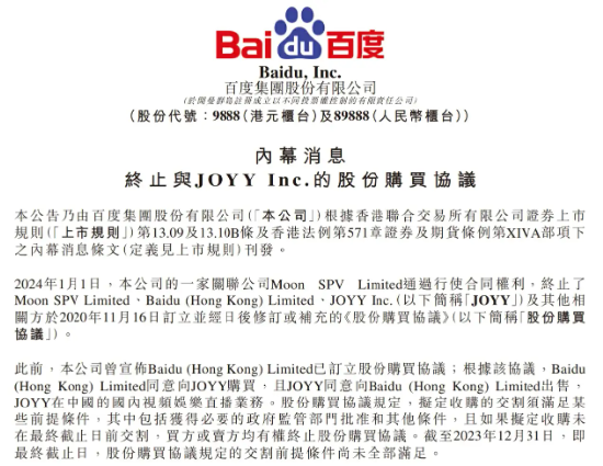 1月1日,百度发布公告,其关联方Moon将终止对YY直播的收购。据了解,该笔收购案交割的前提,是需要获得政府监管部门的批准。而百度公告指出,截至2023年末交割前提条件尚未全部满足。